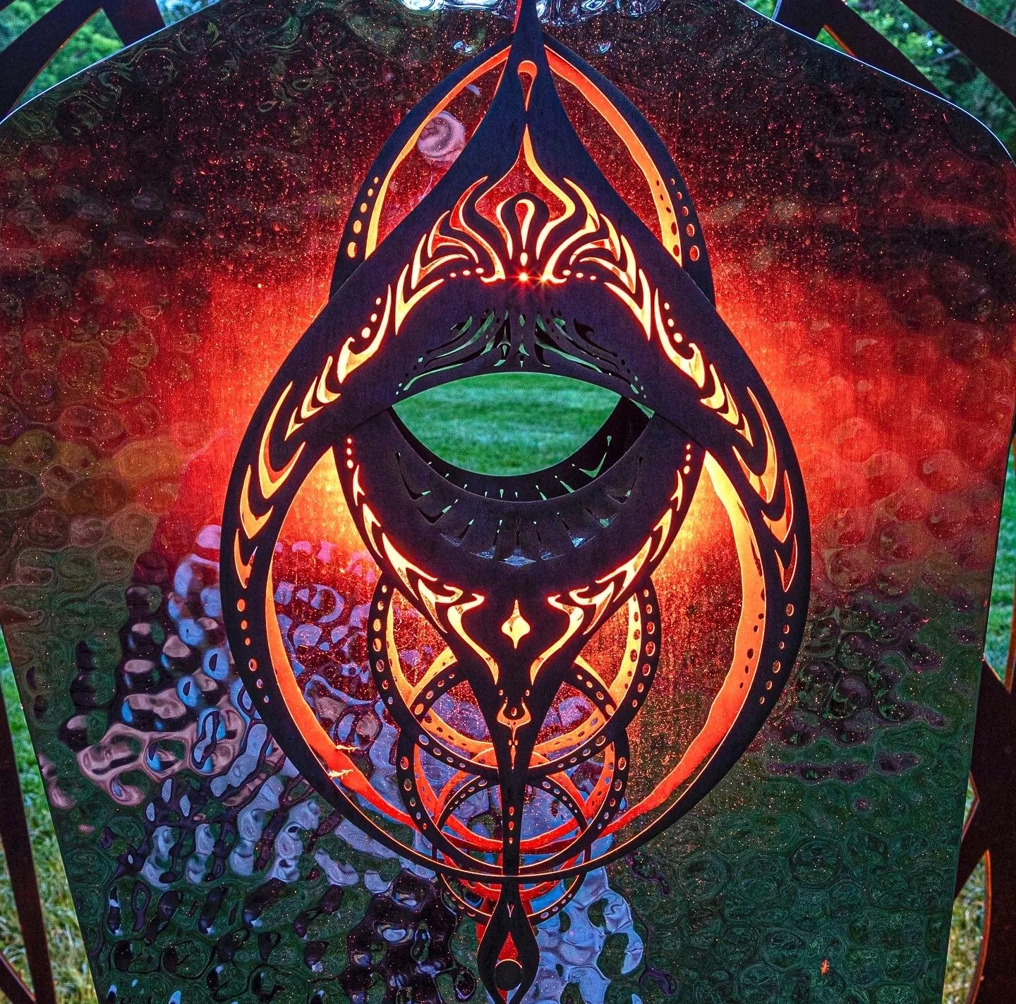 A portal of embodied energy, reflection and light opens before you. Interwoven arcs, reminiscent of a DNA spiral, loft upwards around a human silhouette held in a circular energetic field. The interplay of space and form, the tactile quality of spectral and worn materials, and the reminiscent interplay of presence and absence, aspire to capture a feeling of both ephemerality and infinite existence.